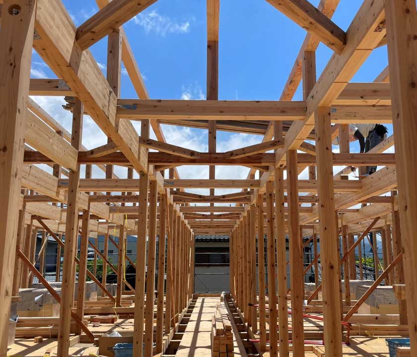 「トラス」「大梁」「登り梁」「タイコ梁」「金物加工」「丸柱」「床合板」など、機械では出来ない仕様には、職人の技術力で対応しております。