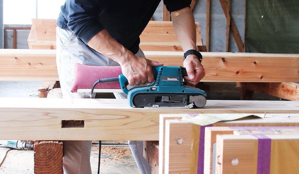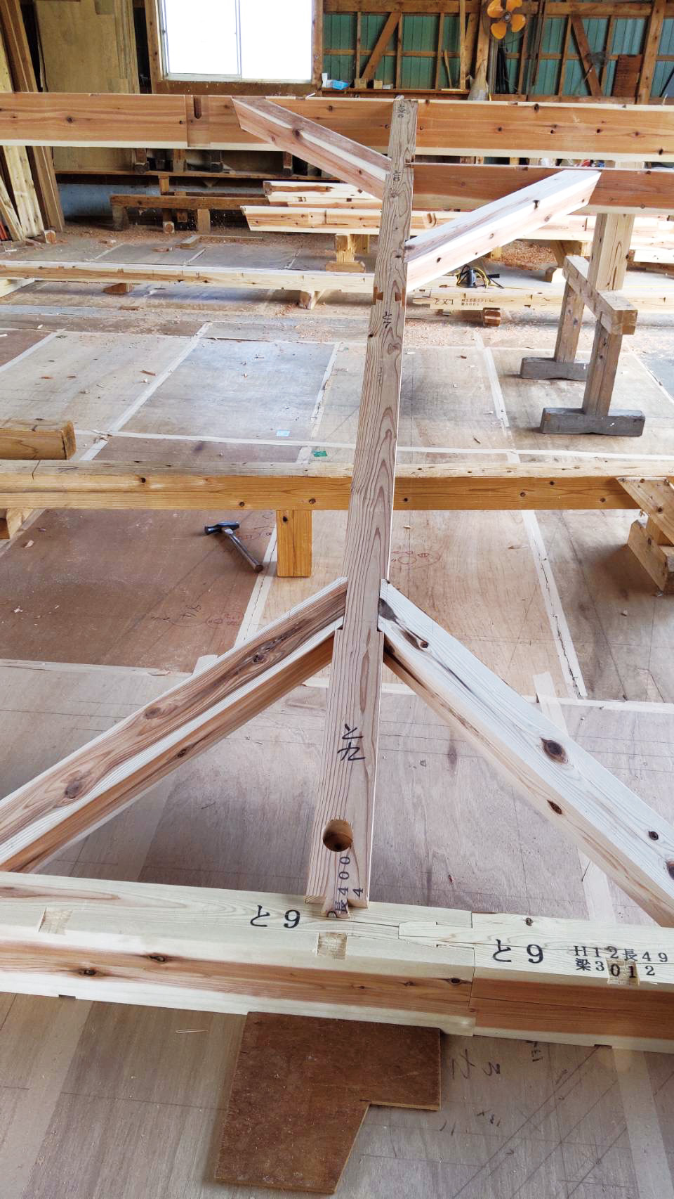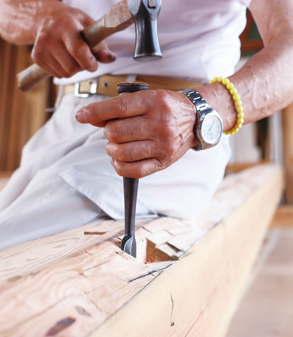 「トラス」「大梁」「登り梁」「タイコ梁」「金物加工」「丸柱」「床合板」「間柱」「根太」「垂木」「筋交い」「打ち抜きほぞ」「ありほぞ」「扇ほぞ」「小根ほぞ」「流れほぞ」「重ねほぞ」など、機械では出来ない仕様には、職人の技術力で対応しております。